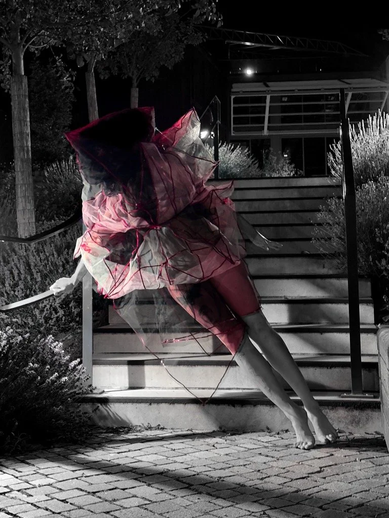 A geometric garment built from rigid triangular modules, designed to protect the body while still revealing it — like a flower held within a structured, vase-like form.