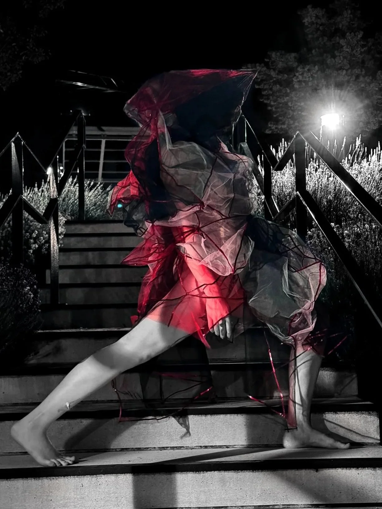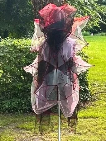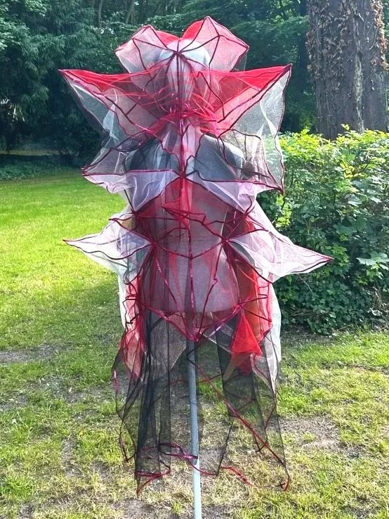 Die Form entsteht aus triangulierten Modulen. Mehrere Dreiecke bilden Flächen, Flächen ergeben Volumen. Die Spikes entstehen dort, wo mehrere Kanten in einem Punkt zusammentreffen. Das Geschenkband habe ich im Verlauf als durchgehende Linie geführt und im Zickzackstich auf den Tüll genäht. Dadurch versteifen sich die Kanten, und die Spitzen bekommen spürbar mehr Stabilität und Präzision.